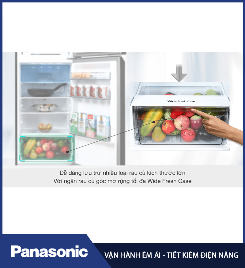 Ngăn rau củ Wide Fresh Case: Dung tích lớn với góc mở rộng tối đa, giúp bạn dễ dàng lưu trữ các loại rau củ có kích thước lớn mà không cần cắt nhỏ. Cấu trúc khép kín giúp duy trì độ ẩm tối ưu, giữ cho rau củ luôn tươi ngon trong thời gian dài.